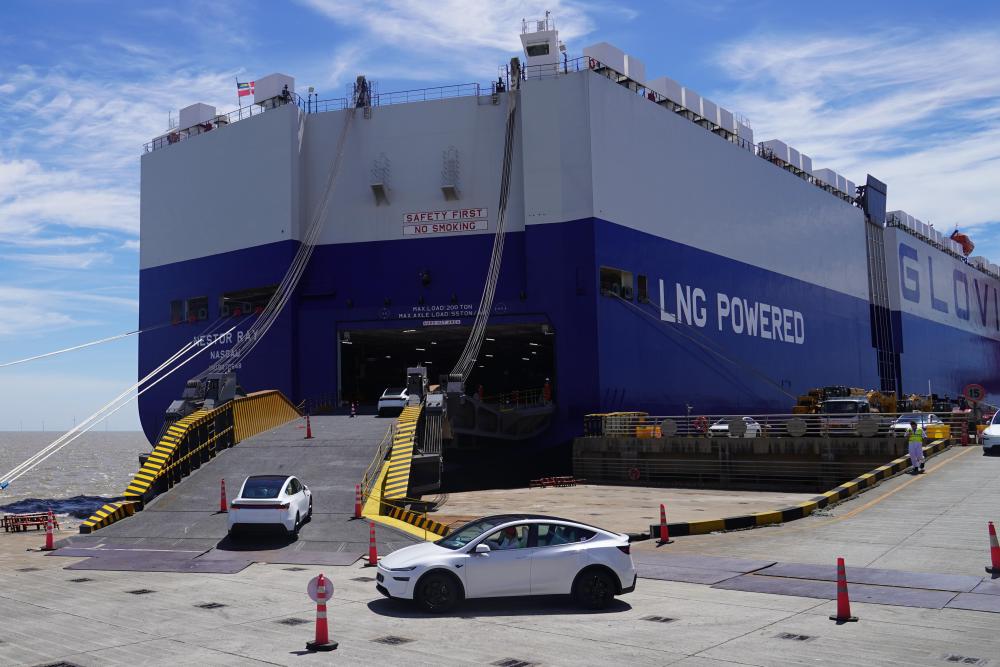 在上海自贸试验区临港新片区南港码头,一批新能源汽车驶向一艘滚装货轮。