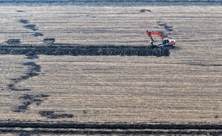 在天津市津南区八里台镇大韩庄村,工人驾驶挖掘机进行高标准农田施工作业。