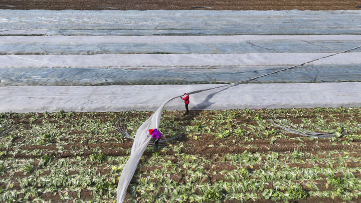 在山东省东营市广饶县李鹊镇,农民为作物覆盖防寒无纺布,应对寒潮。