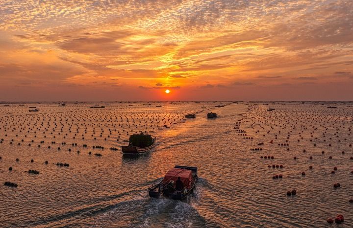 在山东省荣成市爱伦湾鲍鱼养殖区,收获鲍鱼的养殖户驾驶船只返回渔港,