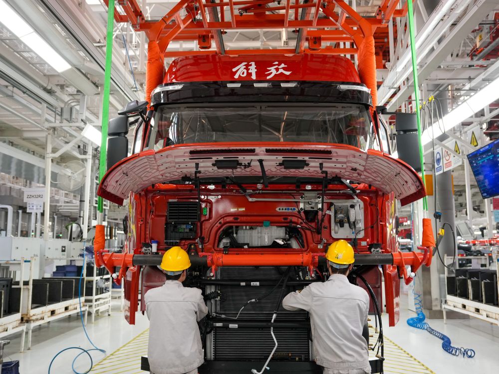工人在位于吉林省长春市的一汽解放J7整车智能工厂装配车辆。