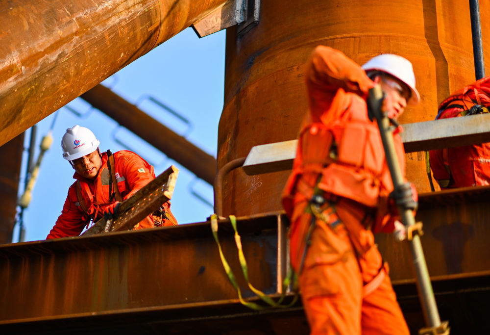 工人在位于渤海中部海域的渤中26-6油田开发项目(二期)作业现场施工。