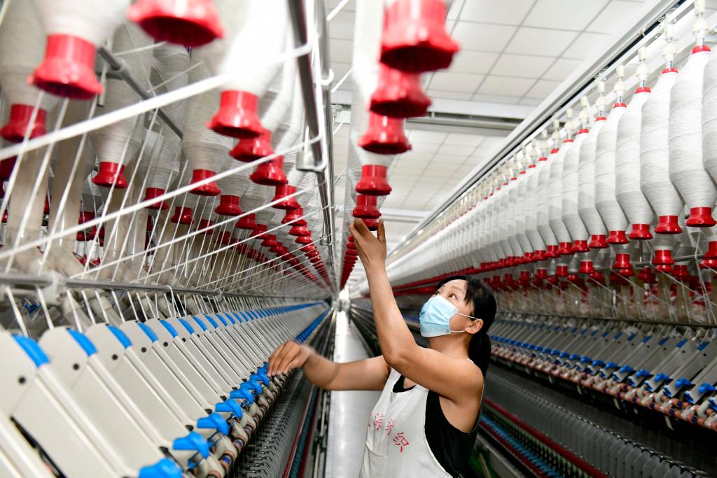 在山东省菏泽市郓城县蓝翔纺织有限公司,工作人员在织机前忙碌。