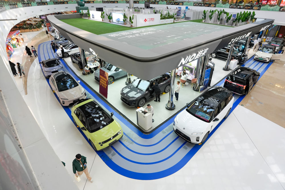 市民在北京市朝阳区一家商场内了解新能源汽车。