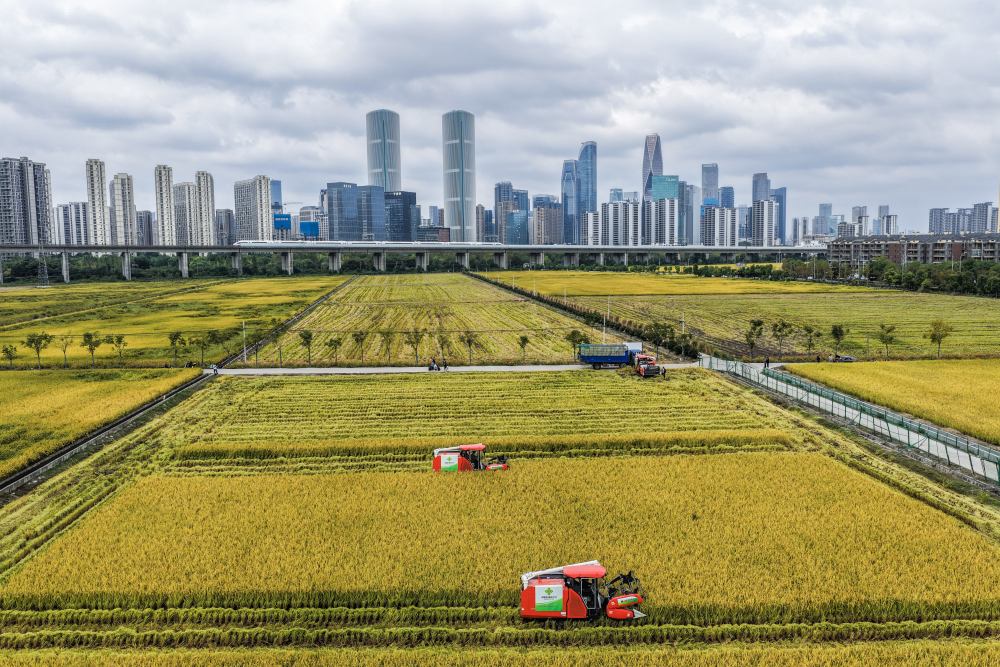 在浙江杭州萧山区,收割机在稻田里收割水稻,远处高铁列车飞驰而过。
