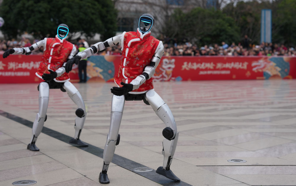 宇树科技人形机器人在浙江省桐庐县中心广场表演舞蹈。