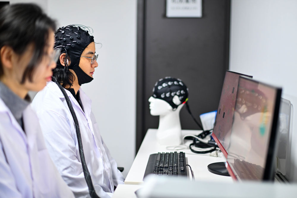 在位于天津滨海高新区的中电云脑(天津)科技有限公司,工作人员进行脑机接口技术测试。