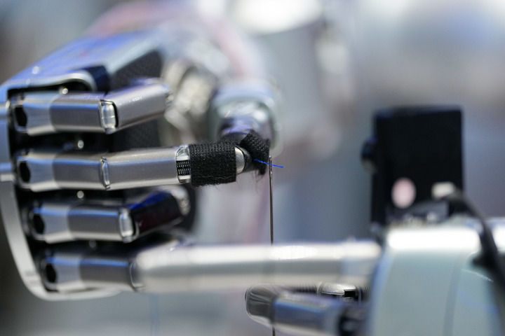 在中关村展示中心常设展上,一台配备了灵巧手的机器人在展示穿针引线。