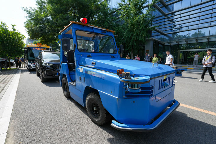 这是在北京驭势科技拍摄的一款用于机场物流作业的无人驾驶牵引车。
