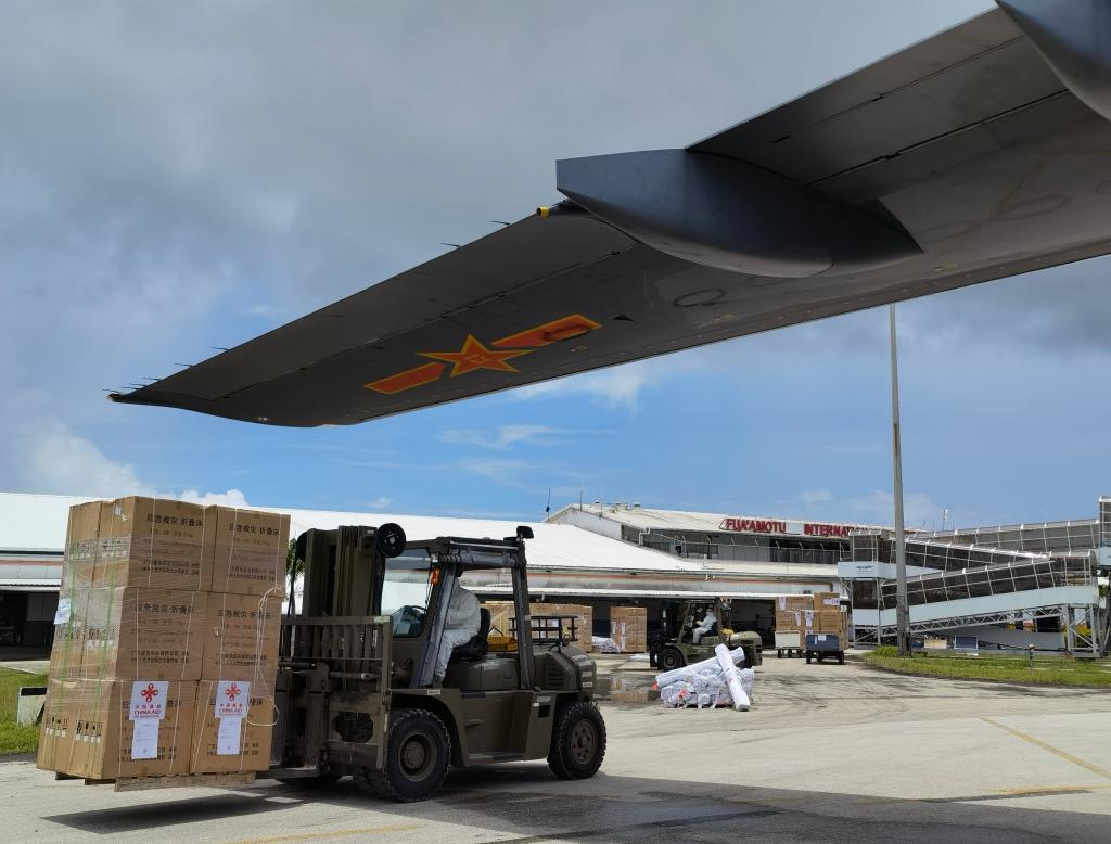 工作人员在汤加首都努库阿洛法机场卸载中国运-20飞机运送来的援助物资。
