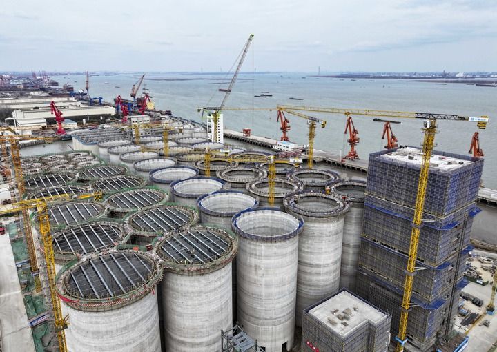在江苏省靖江市拍摄的中粮靖江码头仓储物流项目建设现场。