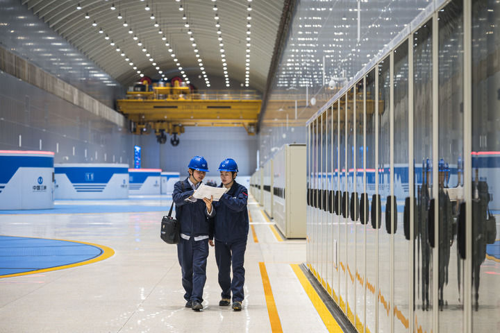 工作人员在白鹤滩水电站开展日常巡检工作。