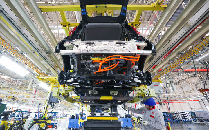 在奇瑞新能源汽车股份有限公司石家庄分公司总装车间,员工装配新能源汽车。