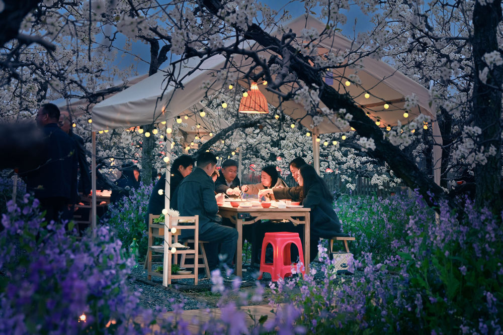 游客在安徽省宿州市砀山县梨小萌欢乐梨园品尝梨园火锅。