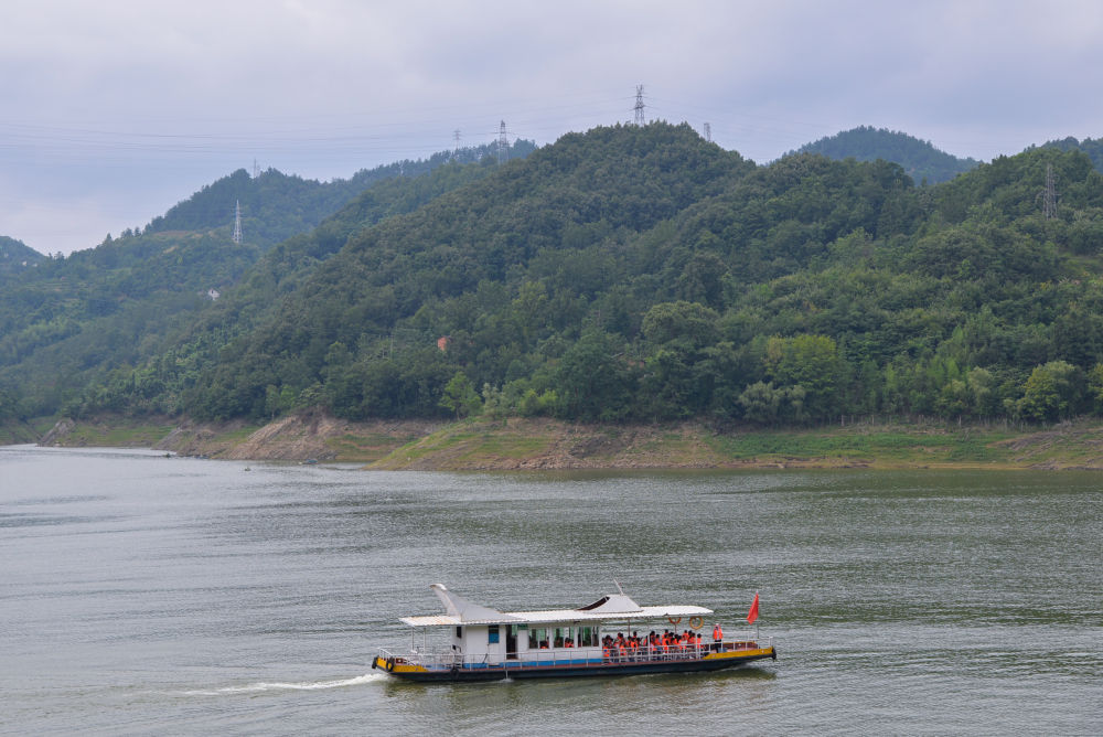 游客在陕西省安康市瀛湖风景区乘船游玩(7月24日摄)。