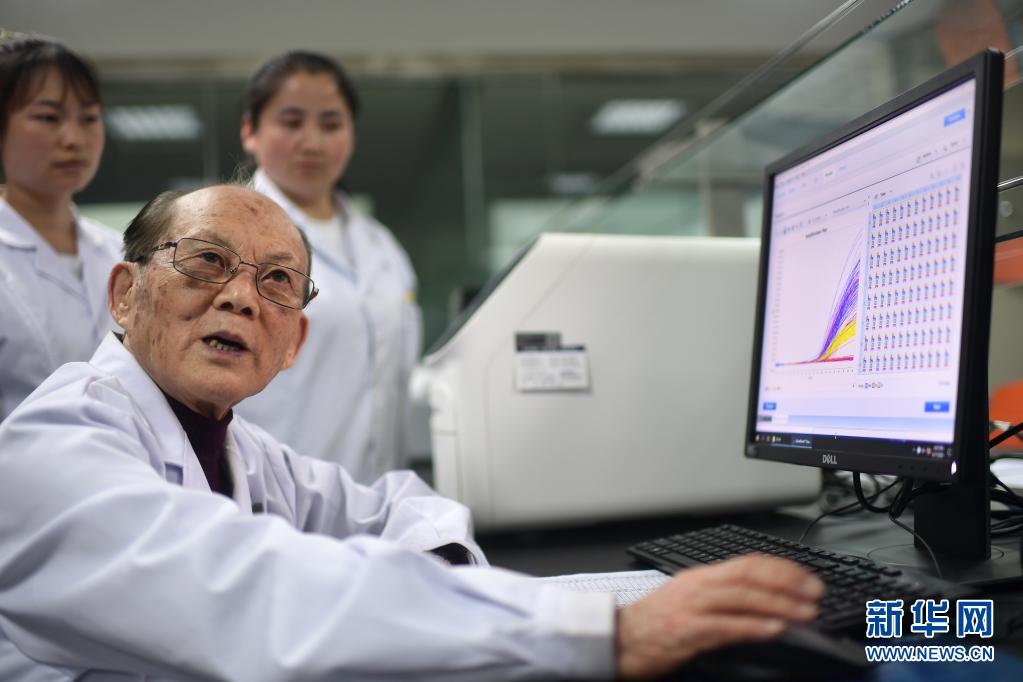 吴天一(前)在青海西宁的实验室内和学生讨论。