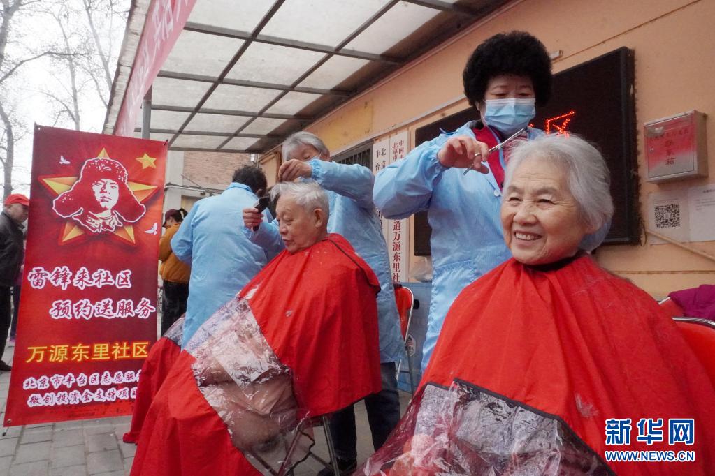 2021年3月5日,北京市丰台区东高地街道的志愿者为社区内的老人理发。