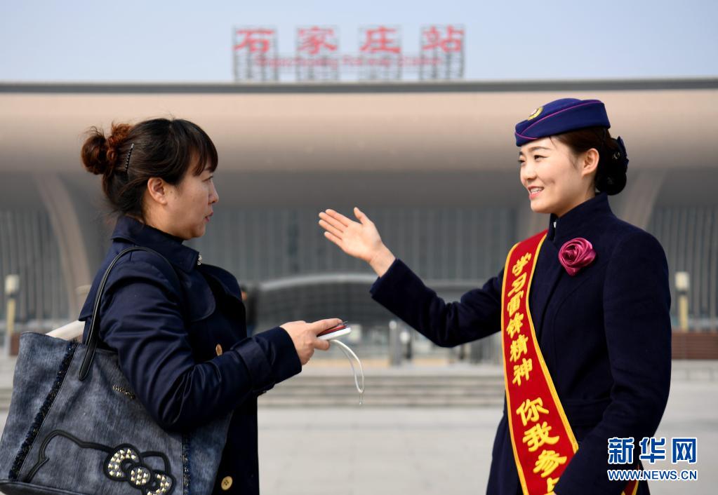 2019年3月5日,在石家庄站广场,中国铁路北京局集团有限公司京铁列服公司石家庄分公司高铁餐吧部的工作人员引导一名旅客前往候车位置。
