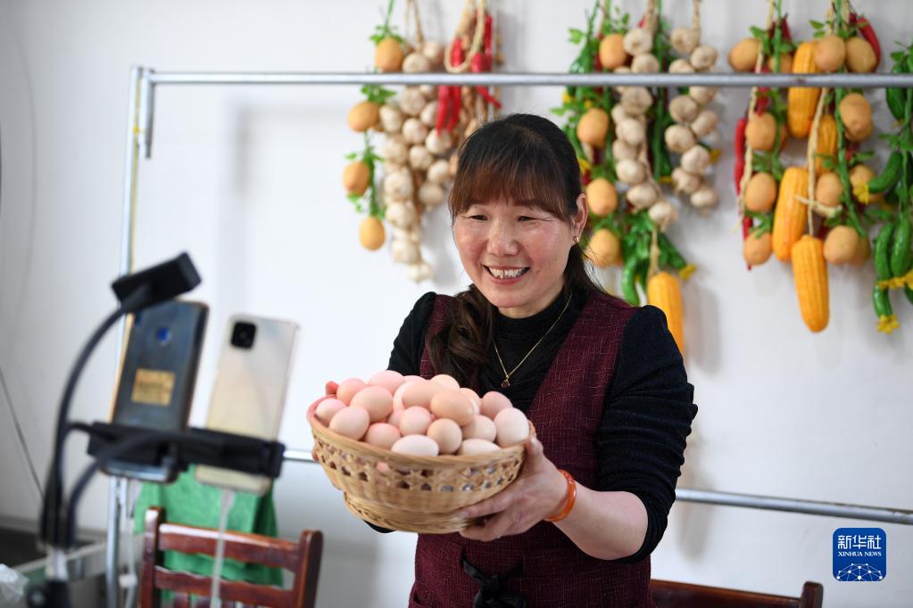 在安徽省六安市舒城县南港镇公义村钱元玲的家庭农场,钱元玲在直播间售卖土鸡蛋(2021年3月4日摄)。