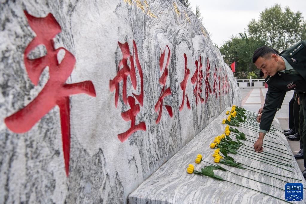 2020年9月25日,在位于山西省大同市灵丘县的平型关大捷纪念馆,工作人员向革命先烈献花。