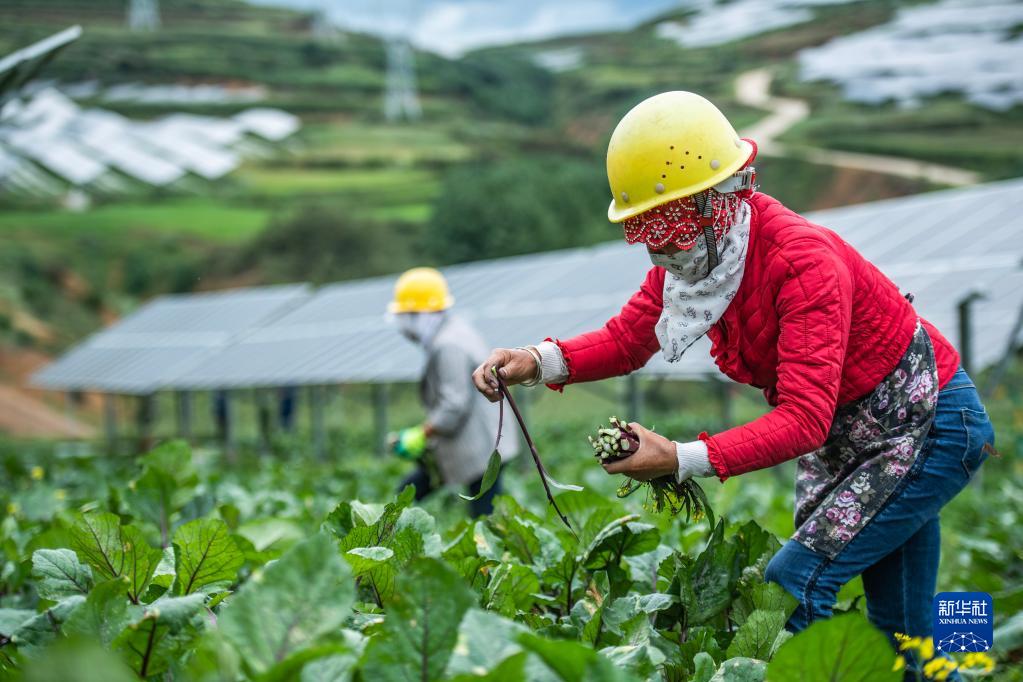 贵州省威宁县村民在仙水窝光伏电站采摘红菜苔(8月24日摄)。