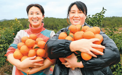 图为湖南省永州市新田县大坪塘镇定家村种植基地的600余亩沃柑喜获丰收,村民怀抱沃柑,笑容满面。钟伟锋摄(人民视觉)
