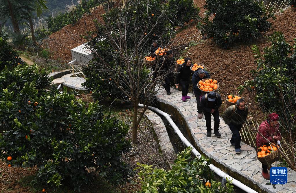 毛相林(右二)和下庄村村民在背运刚采摘的柑橘(2021年1月7日摄)。