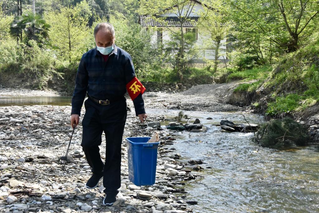 汉水源村村民聂友松正在河道上捡拾垃圾。