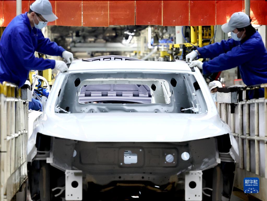 上汽临港乘用车工厂工人在总装车间工作(4月23日摄)。