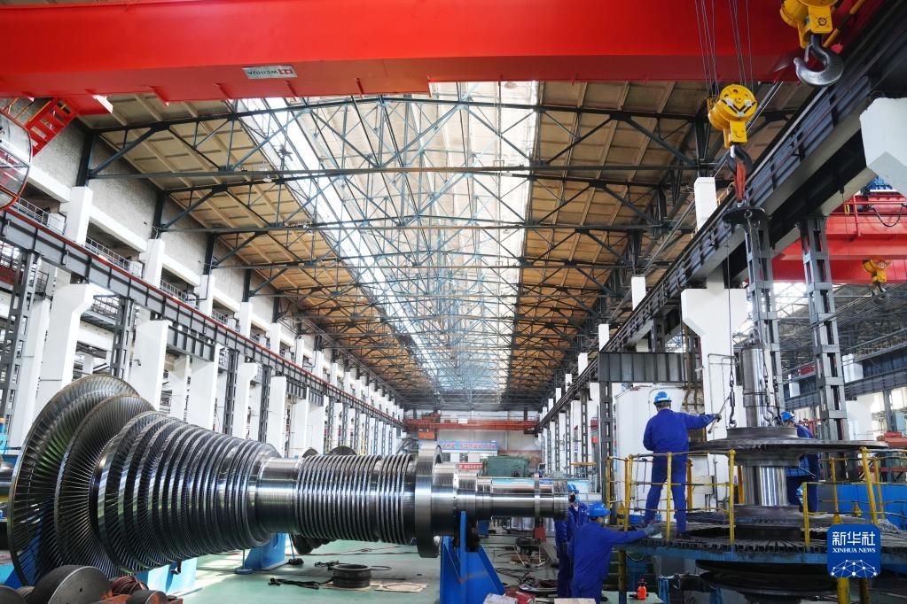 在哈电集团哈尔滨汽轮机厂有限责任公司生产车间,工人在生产作业(5月7日摄)。
