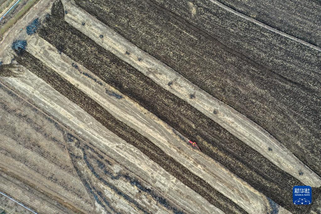 在吉林省吉林市昌邑区孤店子镇红卫村,春新生态家庭农场农民驾驶农机耕地(4月26日摄,无人机照片)。
