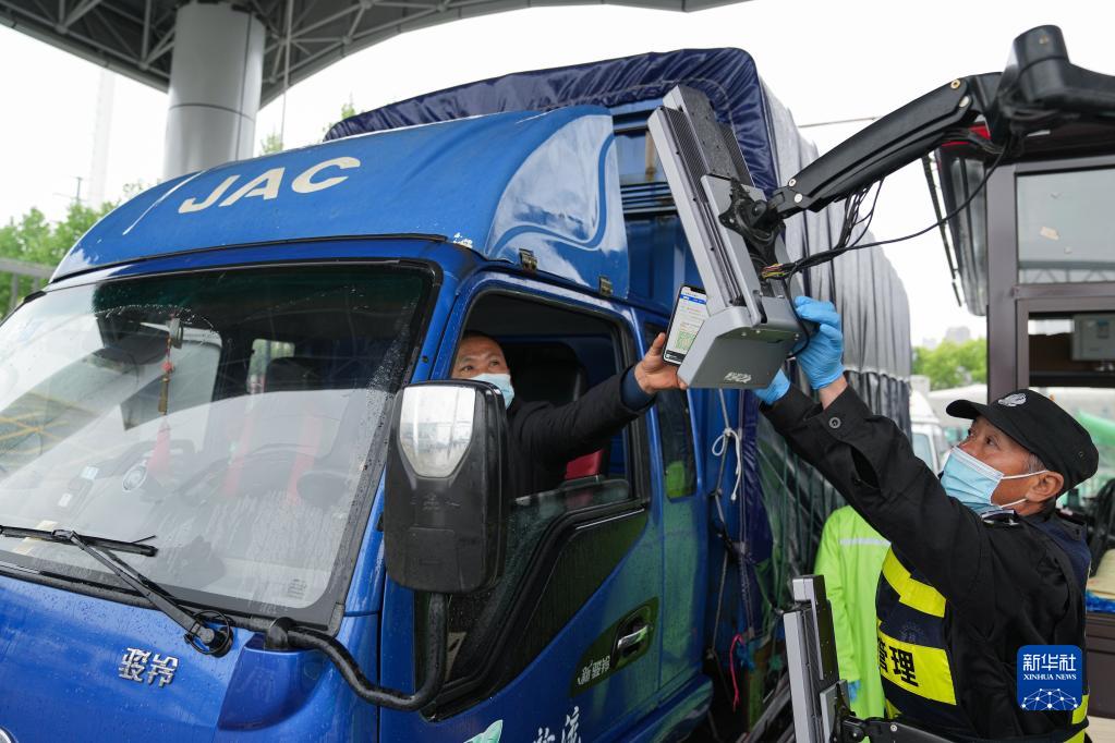 在安徽合肥百大周谷堆大兴农产品物流园,司机在智能化门禁系统上扫码进入(4月13日摄)。该园建立集测温、核验安康码、数据收集等功能的智能化门禁系统,进场驾乘人员不用下车即可快速核验,实现防疫测温智能化、人车追溯数据化。