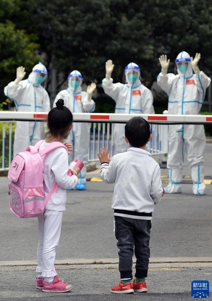 4月30日,走出医院准备回家时,小华(右)和姐姐回身向护送他们出院的医护人员挥手道别。当日,由上海交通大学医学院附属仁济医院南部院区(新冠定点医院)收治的3岁重症新冠患者小华(化名)出院。