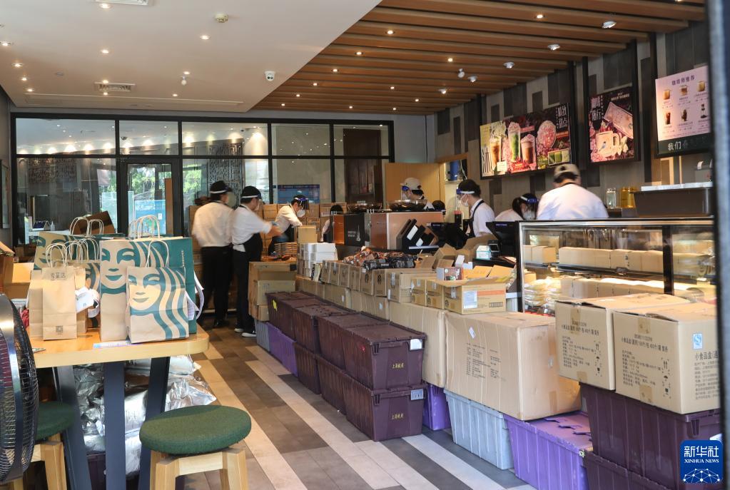 5月17日,工作人员在位于上海市徐汇区的一家星巴克咖啡店内制作网络订单货品。