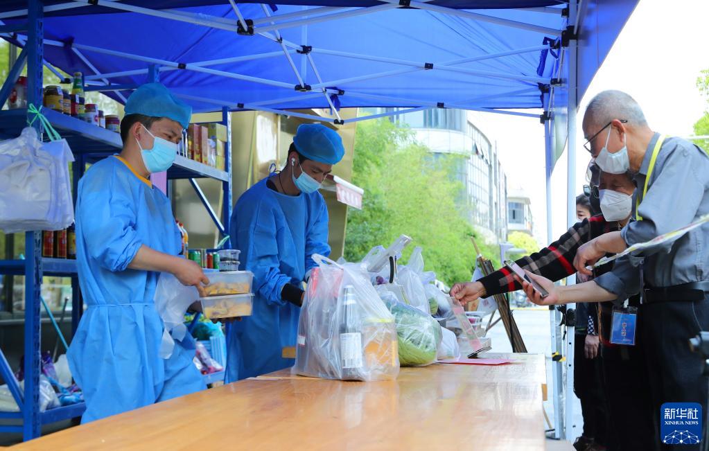 5月17日,市民在上海市嘉定区一家饭店的外卖摊位前扫码购物。