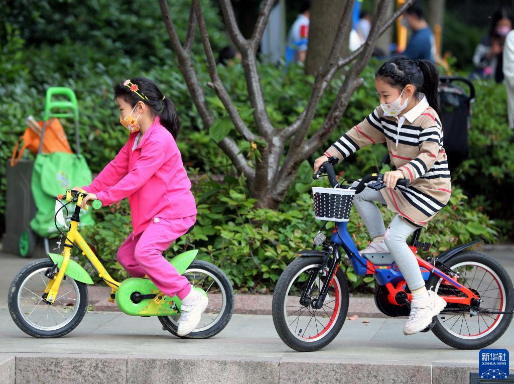 5月17日,在上海市松江区,小朋友们在骑自行车。