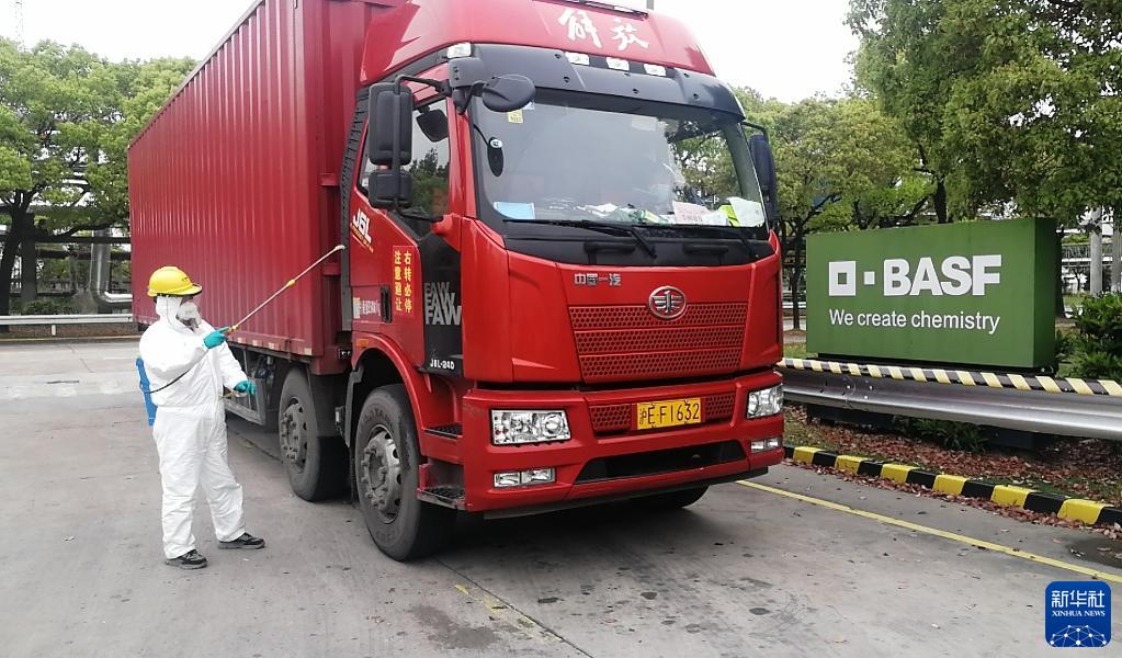 工作人员在位于上海市金山区的巴斯夫护理化学品(上海)有限公司工厂对货车进行消杀(4月15日摄)。
