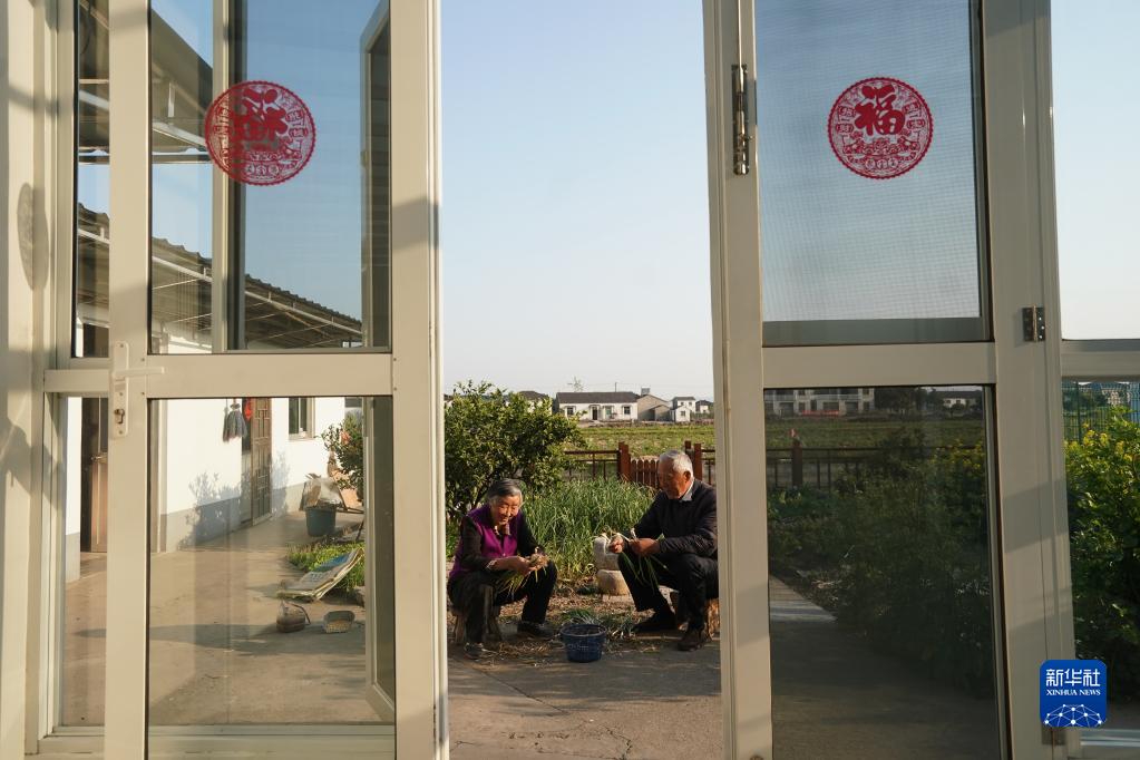 镇江市世业镇永茂圩自然村村民洪家勇(右)和老伴杨松华在家中忙家务(2020年4月13日摄)。