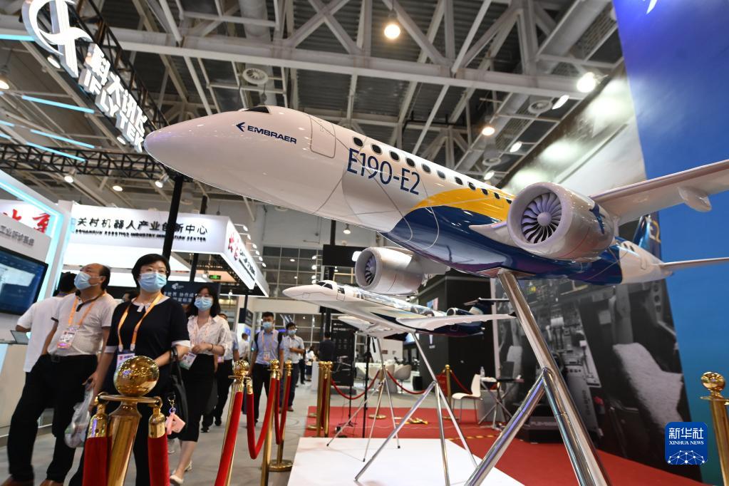 参观者从2021金砖国家新工业革命展展出的飞机模型前走过(2021年9月8日摄)。