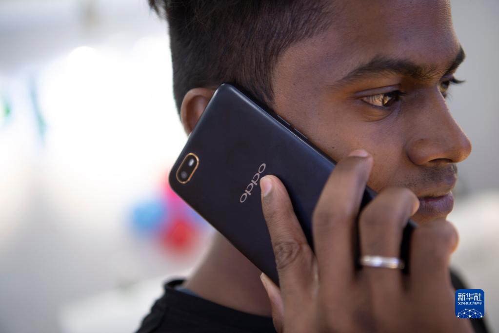 2019年10月8日,一名男子在印度金奈的一家商场使用中国品牌的手机。