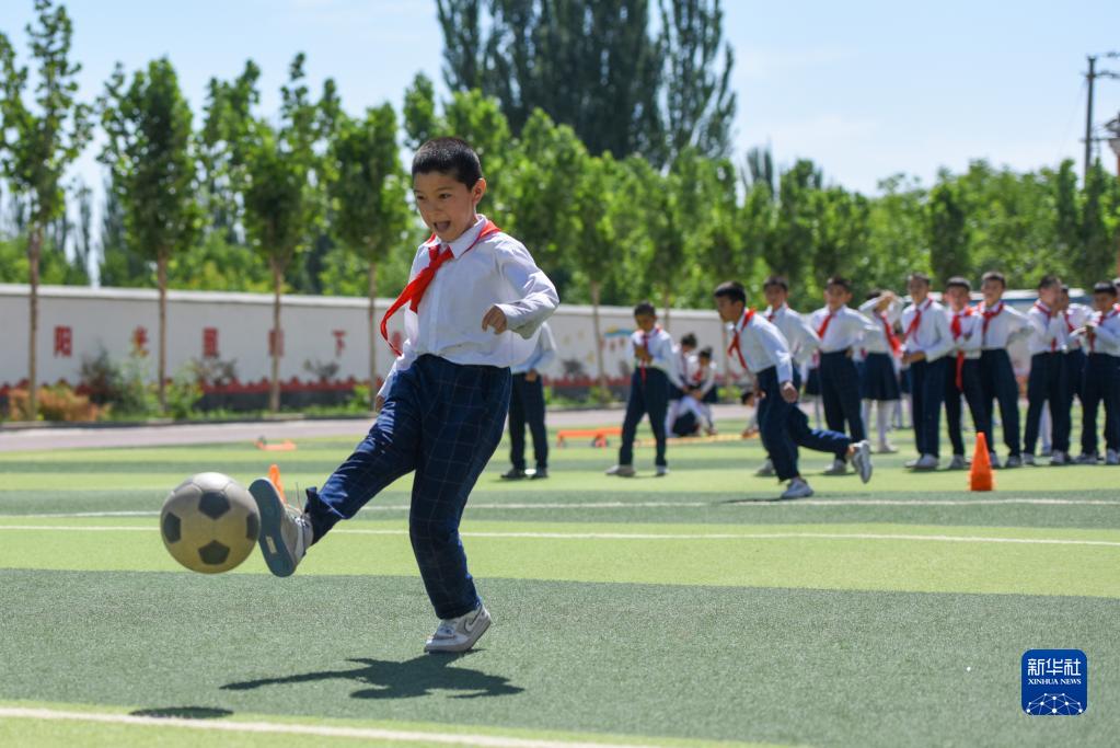 在新疆喀什地区疏附县托克扎克镇中心小学,学生们在上体育课(2022年6月10日摄)。