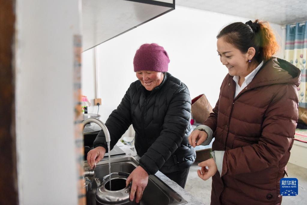 在新疆福海县解特阿热勒镇京什开萨尔村,村干部(右)来到前不久刚接通自来水的村民家中了解水质情况(2021年11月25日摄)。