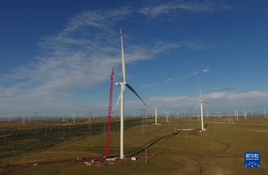 在河北张家口市张北县大河乡,工人在一处风电场安装风力发电机(2020年9月15日摄,无人机照片)。