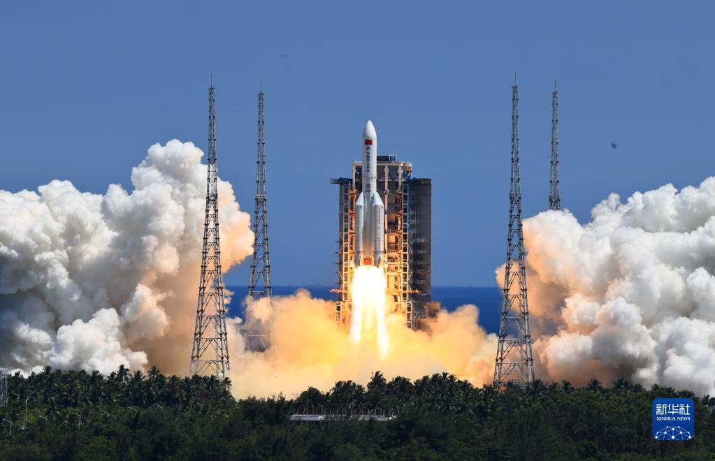 搭载问天实验舱的长征五号B遥三运载火箭,在我国文昌航天发射场点火发射(2022年7月24日摄)。