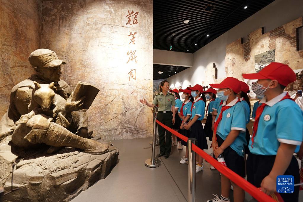 2021年5月30日,在位于河北省邢台市信都区浆水镇的中国人民抗日军政大学陈列馆,工作人员向小学生们讲述抗大历史。