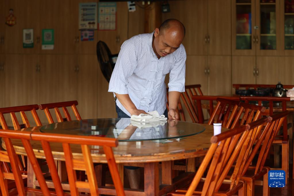 在湖南省湘西土家族苗族自治州十八洞村,杨正邦在自家农家乐打扫卫生(2022年7月2日摄)。