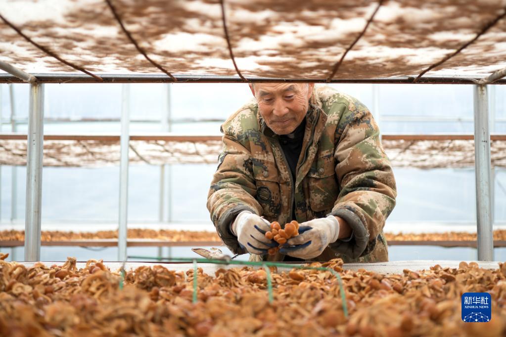 在黑龙江省绥化市明水县兴仁镇石人村的食用菌种植基地,建档立卡户林德山在晾滑子蘑,他在这里打工年收入在1万元以上(2020年10月11日摄)。