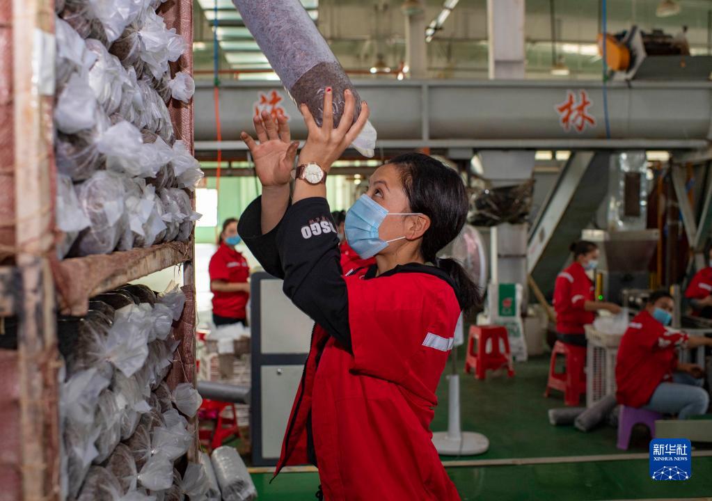 新疆墨玉县萨依巴格乡村民阿孜古丽·阿卜力提甫在当地一家菌业公司的菌种装袋车间工作(2020年9月22日摄)。