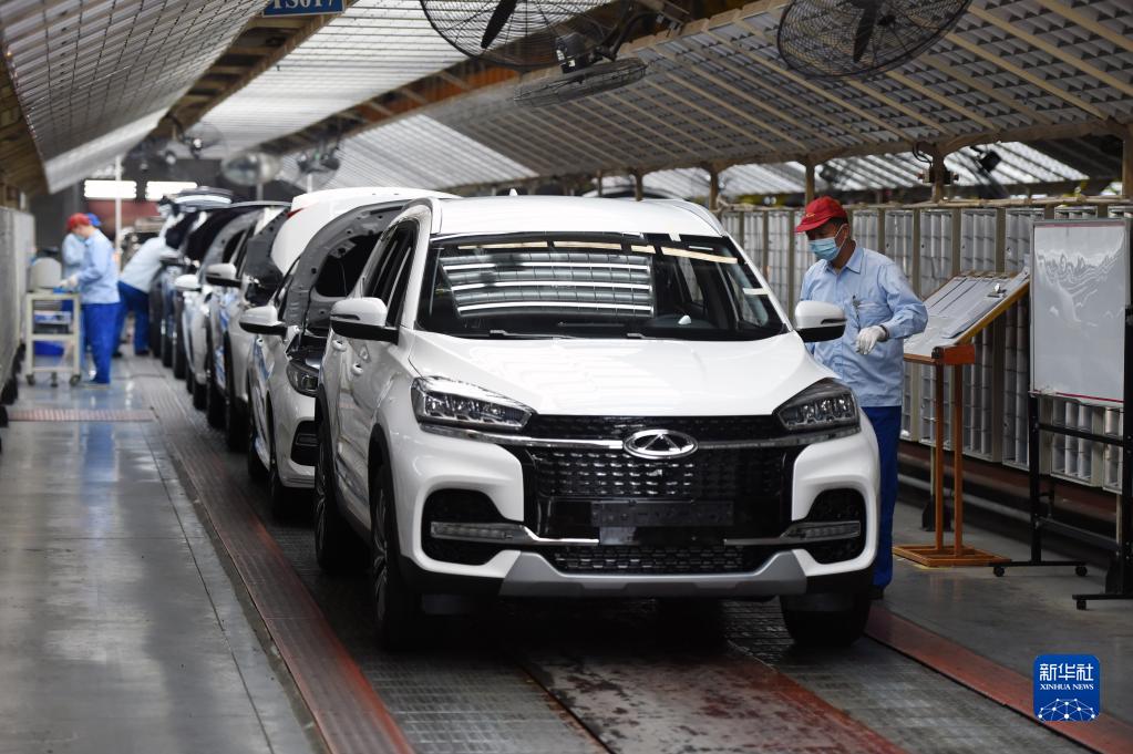 在位于安徽省芜湖市的奇瑞汽车股份有限公司,工人在总装三车间内工作(2020年5月20日摄)。