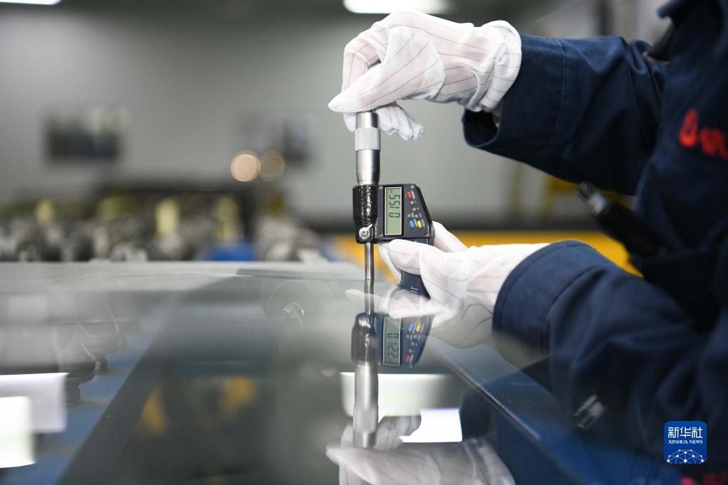 在位于安徽省蚌埠市的蚌埠中建材信息显示材料有限公司内,工作人员在测量超薄电子信息显示玻璃的厚度(2021年12月21日摄)。